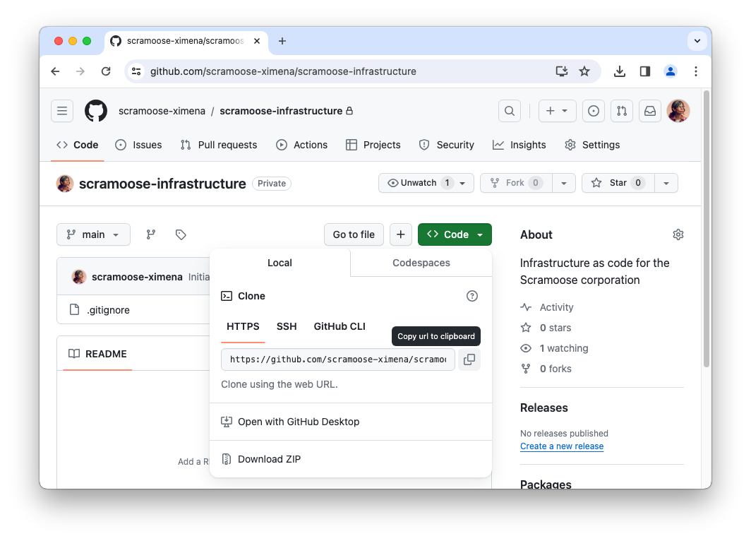 Your repository should now be cloned into a subfolder of your Projects folder, for example /Users/ximena/Projects/scramoose-infrastructure.